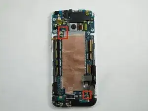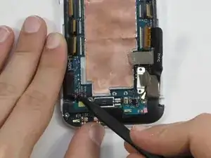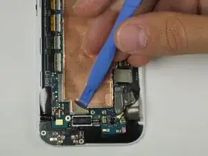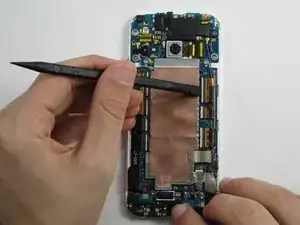Используйте заострённый конец лопатки, чтобы отщёлкнуть четыре антенных разъёма. Три находятся в верхнем левом углу платы и один в нижнем правом.