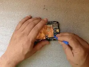 Осторожно подденьте экранирующую пластину в верхней части телефона в направлении аккумулятора.