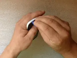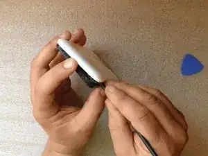 Аккуратно вставьте пластиковый инструмент под аккумулятор и подденьте его, чтобы оторвать от клея. Избегайте сгибания аккумулятора.