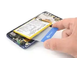 Вставьте медиатор для вскрытия или пластиковую карту под батарею в том месте, где была клейкая полоска.