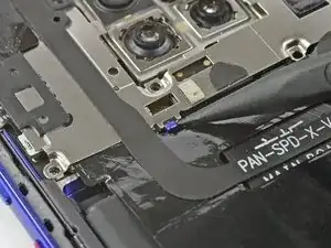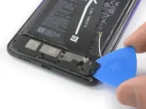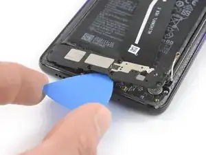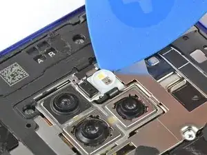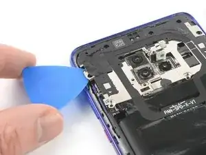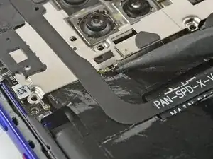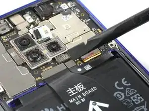 Используйте медиатор, чтобы аккуратно отпрепятствовать модуль вспышки от крышки платы и отложите его в сторону от аккумулятора. Избегайте повреждения шлейфа модуля вспышки.
