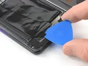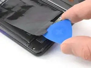 Подденьте медиатором нижний край чёрной защитной фольги, закрывающей аккумулятор. Используйте медиатор, чтобы ослабить клей, прикрепляющий фольгу к громкоговорителю.