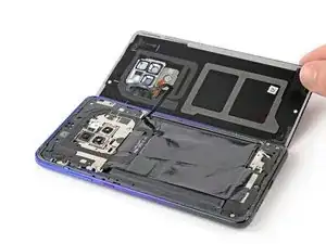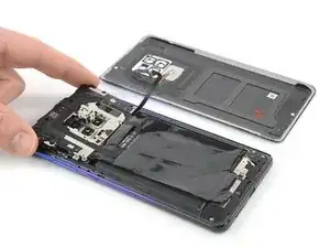 Осторожно отогните заднюю крышку в правую сторону от сборки телефона. Избегайте натяжения кабеля сканера отпечатков в процессе.