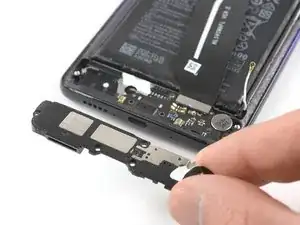 Продвигайтесь вдоль нижнего края крышки динамика в направлении зарядного порта. Используйте медиатор, чтобы поддеть динамик по ходу работы.