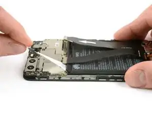 Вытащите клеевую ленту, расположенную под аккумулятором, равномерно тянув вкладку под небольшим углом.