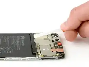 Между аккумулятором и платой расположен натягивающийся клейкий язычок; используйте пинцет, чтобы вытащить их из зазора перед началом вытягивания.