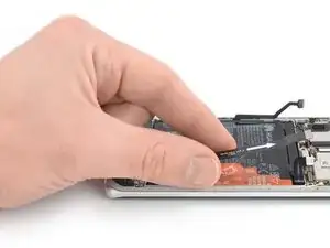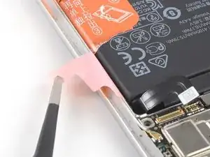 Отогните соединительный гибкий кабель в сторону зарядного порта, чтобы получить доступ к вытяжным лентам батареи.
