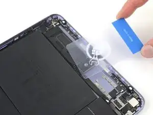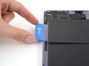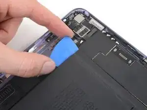 Вставьте пластиковую карту между верхним краем платы аккумулятора и рамой, используя зазор, созданный инструментом для вскрытия.