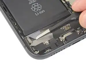 Используйте пинцет, чтобы поднять и снять черную ленту и резиновую накладку, закрывающие разъем Taptic-двигателя.
