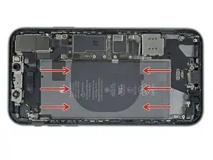 Начинайте с верхнего или нижнего края аккумулятора и тяните в направлении к середине. Не тяните нить через центральную треть аккумулятора, иначе вы можете повредить ленточные кабели или катушку беспроводной зарядки непосредственно под ним.