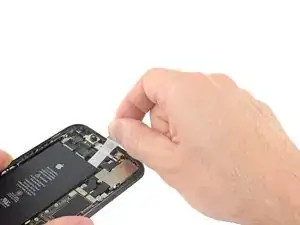 Медленно потяните одну вытяжную ленточку клея от батареи, вниз, в сторону нижнего края iPhone.