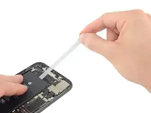 Снова вставьте медиатор в нижний край iPhone и проведите им вверх по правой стороне, продолжая разъединять клей.