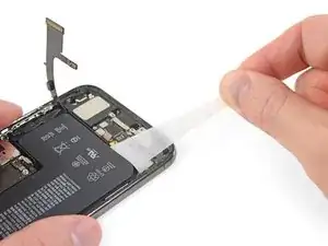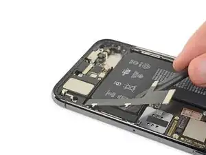 Используя ту же процедуру, что и раньше, одновременно потяните обе вкладки, чтобы растянуть и снять оставшуюся клеящую полоску, удерживающую аккумулятор на месте. Старайтесь не зацепить клей за край iPhone.