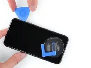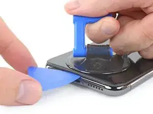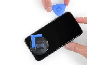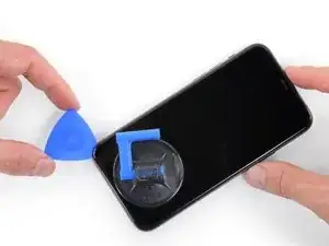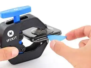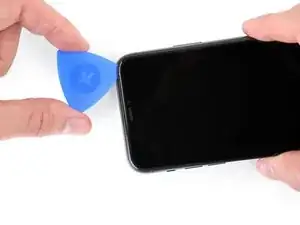 Герметичный клей, удерживающий дисплей на месте, очень прочен; создание этого начального зазора требует значительного усилия. Если вам трудно открыть зазор, примените больше нагрева и осторожно покачайте экран вверх-вниз, чтобы ослабить клей, пока не получится вставить инструмент.