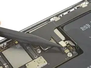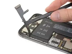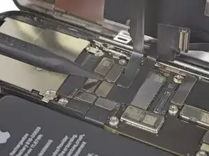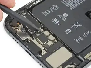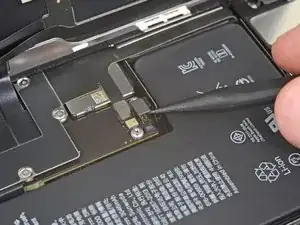 Подденьте, чтобы отсоединить оба разъёма гибкого кабеля Lightning от платы логики.