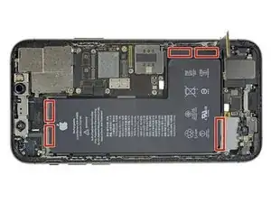 Батарея прикреплена к задней части корпуса тремя кусками растягивающегося клея — одним возле нижнего края батареи, одним возле верхнего и одним справа.