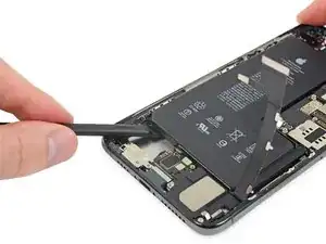 Возьмите обе ленты одновременно и медленно тяните, чтобы растянуть клей от батареи в направлении верхней части iPhone.