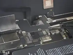Используйте отвёртку Y000, чтобы удалить шесть винтов длиной 1,3 мм, фиксирующих кронштейн крышки платы.