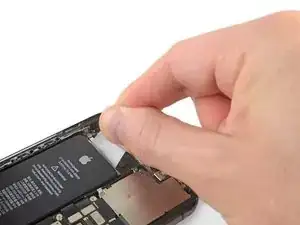 Будьте осторожны, чтобы аккумулятор не вылетел из iPhone при извлечении последней клеящей полоски.