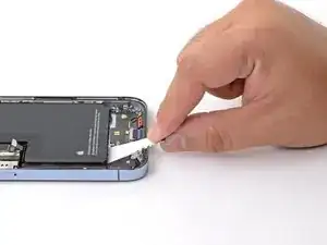 Возьмите вторую вынимную бирку пальцами или серединой лопатки и тяните её от аккумулятора в направлении низа iPhone.