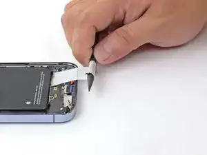Возьмите первую вынимную бирку пальцами или серединой лопатки и медленно тяните её от аккумулятора в направлении низа iPhone.