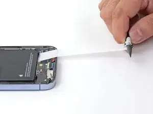 В следующих шагах Вы будете тянуть каждый язычок, чтобы постепенно растянуть клей под аккумулятором. Эти клеевые полоски теряют сцепление при растяжении, поэтому аккумулятор можно легко извлечь.