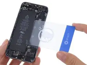 Переверните iPhone и вставьте пластиковую карту между стороной батареи, обращённой к корпусу, и задней крышкой.