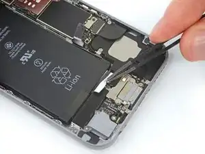 Снимите металлическое крепление разъёма аккумулятора с iPhone.