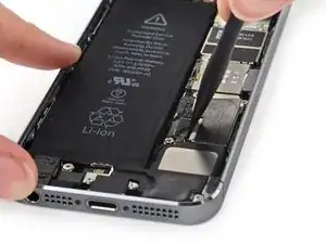 Запустите наконечник лопатки между батареей и разъёмом для наушников, чтобы раскрыть вкладку клея батареи.