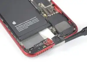 Гнездо этого разъёма расположено свободно между динамиком и Taptic Engine, и его немного неудобно отсоединять. Чтобы упростить процедуру, вы можете использовать медиатор, чтобы прижать гнездо разъёма во время отсоединения.