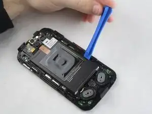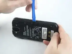 Используя пластиковый инструмент для открытия, подденьте аккумулятор, заправив его по краю.