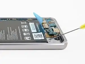 Используйте лопатку, чтобы приподнять защёлку-штекер на конце шлейфа батареи и отключить батарею.