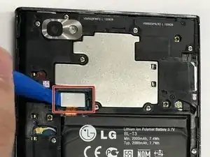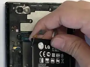 Осторожно используйте пластиковый инструмент для открытия, чтобы отсоединить шлейф, соединяющий аккумулятор с материнской платой телефона.