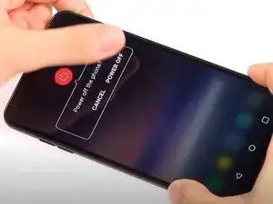 Выключите телефон, нажав и удерживая клавишу питания/блокировки на задней панели телефона в течение трёх секунд. Выберите опцию Выключение и подтвердите Выключить.