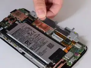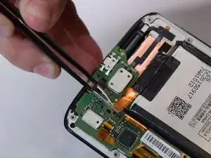 Используйте изогнутые пинцеты, чтобы отключить маленький разъём рядом с правым нижним углом аккумулятора.