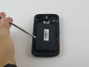 После отсоединения кабеля аккумулятора от материнской платы используйте металлическую лопатку, осторожно введите её в маленькое отверстие около динамика и подденьте материнскую плату, чтобы образовалось достаточно места, чтобы просунуть палец между материнской платой и корпусом телефона.