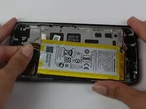 Отключите аккумулятор, поддев чёрный разъём пластиковым инструментом для открытия. Это отключит питание телефона и предотвратит дальнейшие повреждения.