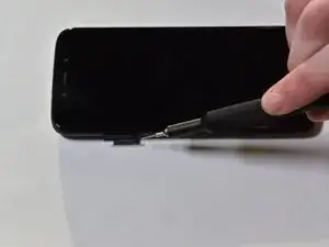 Вставьте скрепку или инструмент для извлечения SIM-карты в маленькое отверстие в лотке SIM-карты на правой стороне верхнего торца телефона.