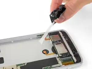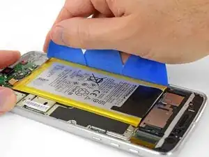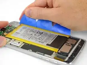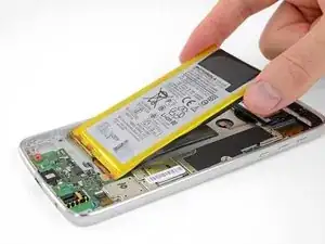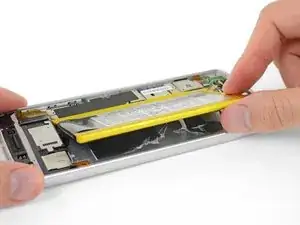 Если клейкие ленты порваны или чёрная вытягивающая лента отсутствует, аккумулятор всё ещё можно снять с помощью нагрева и/или изопропилового спирта для ослабления клея.