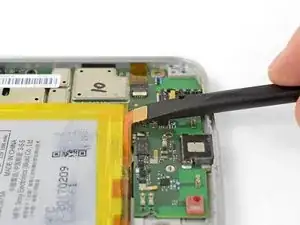 Используйте лопатку, чтобы отключить аккумулятор, поддев его разъём вертикально вверх от материнской платы.