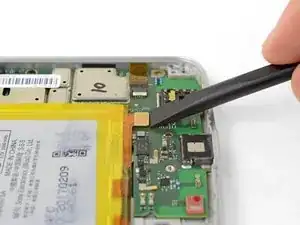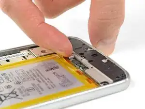 На противоположном конце телефона используйте лопатку, чтобы откинуть фиксирующий язычок на разъёме кабеля дисплея.