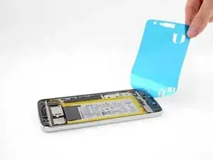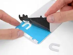 Снимите оставшиеся защитные плёнки, чтобы открыть клей, перед тем как прижимать новый аккумулятор на место.