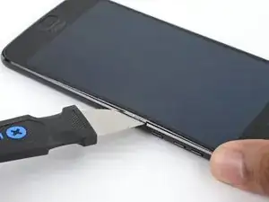Проведите инструментом вдоль всей левой кромки телефона, чтобы отделить металлические защёлки и клей, удерживающие сборку экрана.