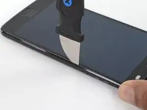 Проведите инструментом вдоль всего нижнего края телефона, чтобы разрезать клей, удерживающий сборку экрана, и освободить пластиковые защёлки.