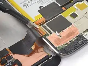 С помощью лопатки подденьте фиксирующий язычок на ZIF-разъёме шлейфа дисплея.