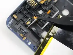 Осторожно с ленточным кабелем кнопок питания и громкости на левой стороне рядом с кнопкой громкости. Кабель открыт и может быть повреждён инструментом для вскрытия.