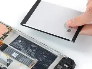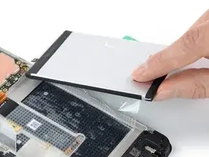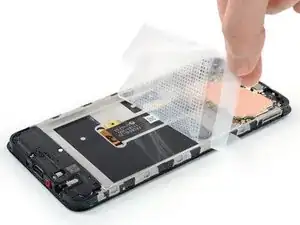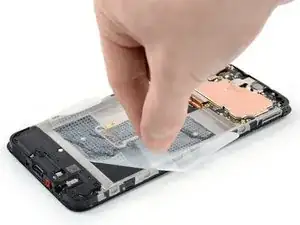 Снимите прозрачную подложку с преднарезанного клея для батареи и приклейте липкую часть к отсеку для батареи. Удалите непрозрачную подложку перед продолжением сборки.