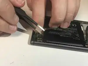 Подденьте угол аккумулятора пинцетом и выньте его.