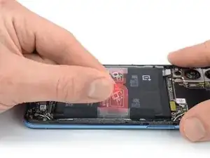 Используйте пинцет с притуплёнными концами, чтобы отлепить правую вытяжную бирку от батареи, пока вы не сможете схватить её пальцами.