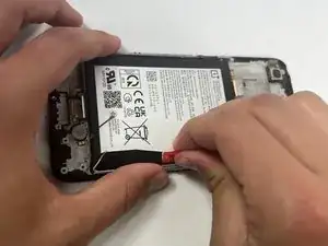 Потяните за красную язычок, чтобы начать извлечение аккумулятора и клеящей ленты вокруг него.